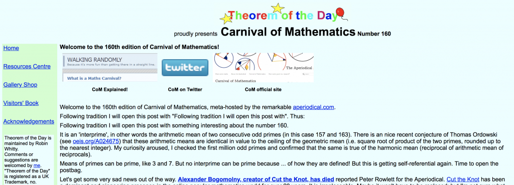 The next issue of the Carnival of Mathematics, rounding up blog posts from the month of November 2025, is now online at TomMaths. The Carnival rounds up maths blog posts from all over the internet, including some from our own Aperiodical. See our Carnival of Mathematics page for more information.