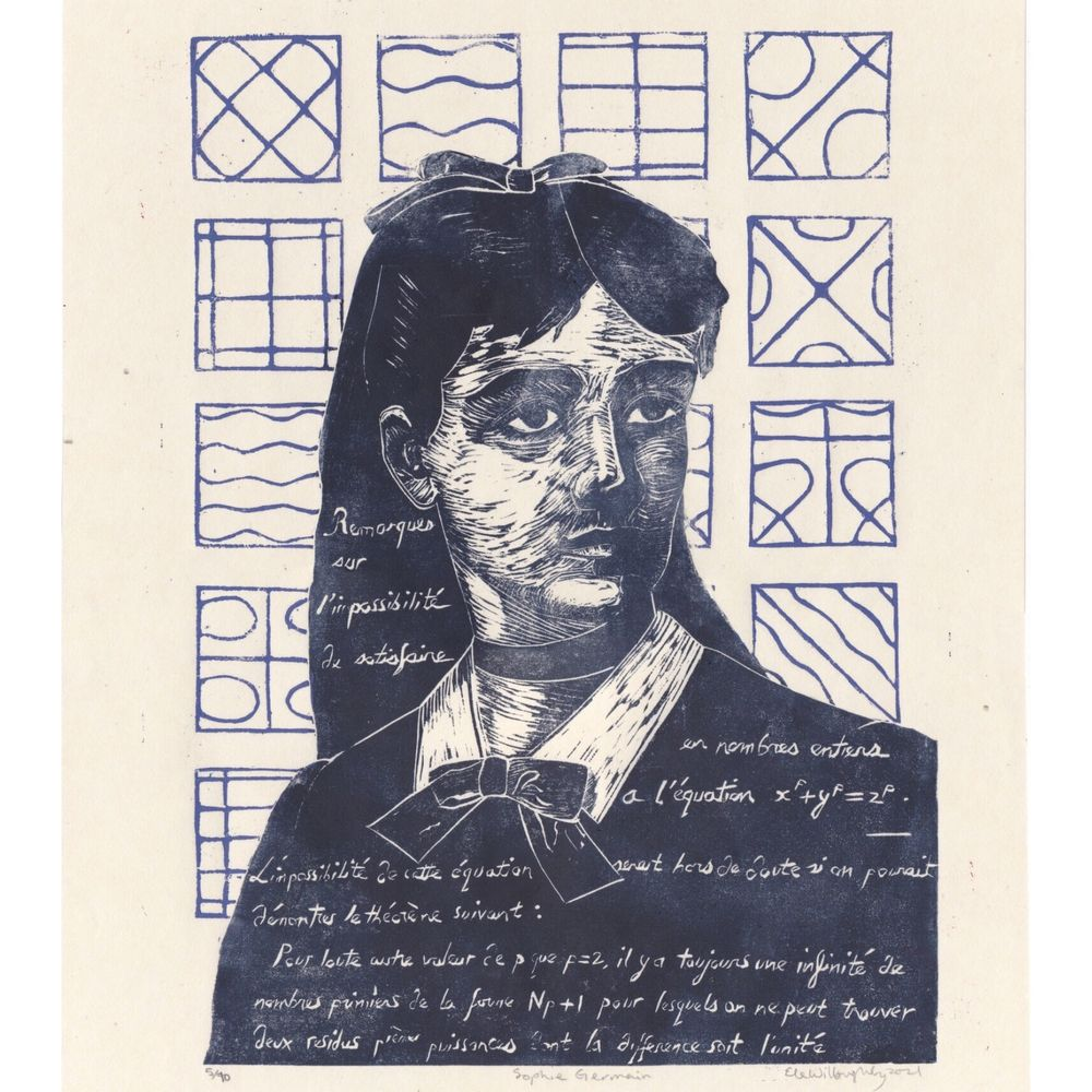 Day 21 – Prompt: Font – This linocut portrait of Sophie Germain is amazing, and I really like how Ele has incorporated some of Germain’s handwriting into the piece.