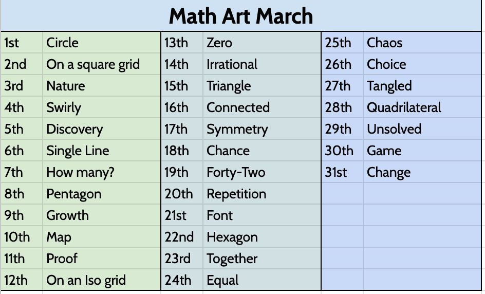 March is a month of change in the UK: the days get longer, the temperature is slowly creeping upwards, and we start to believe that spring may be arriving. Through this month of change I have been really enjoying all the #MathArtMarch posts that have been appearing on Mathstodon and Bluesky.