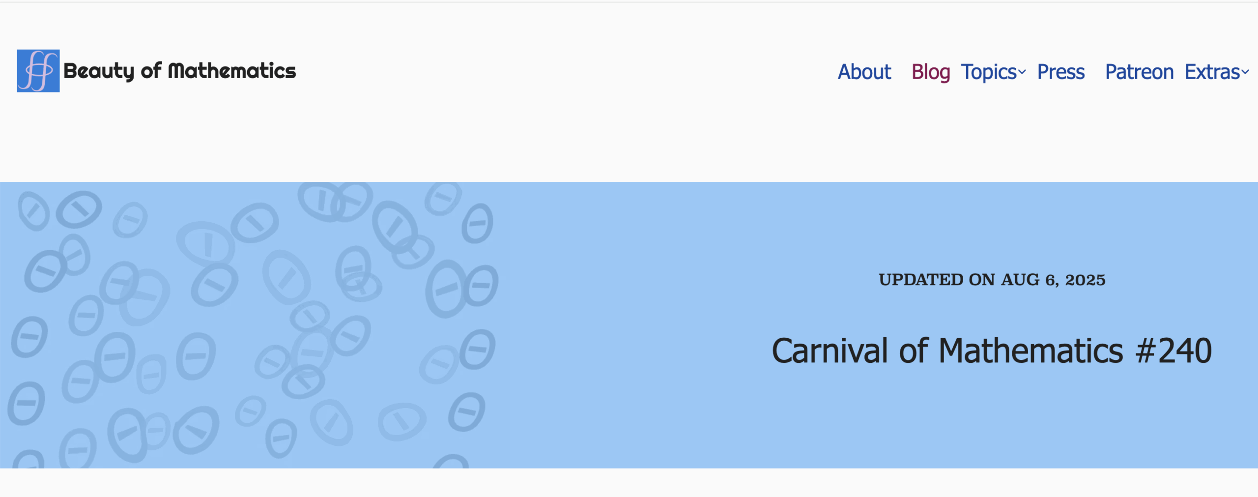 The next issue of the Carnival of Mathematics, rounding up blog posts from the month of May 2025, is now online at Beauty of Mathematics.