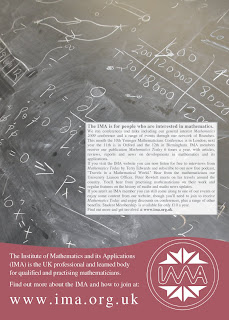 I have designed adverts to go on the back cover of iSquared Magazine in the next 4 issues. Each highlights an aspect of IMA membership and will provide a regular income to support iSquared, something the IMA are keen to do. The first advert concentrates on recreational mathematics. The advert is below, click on it to see a larger version. Unfortunately the version in the magazine contains printing errors (some misaligned text). The IMA have received an apology from iSquared and we are working to make sure this doesn’t happen next time.